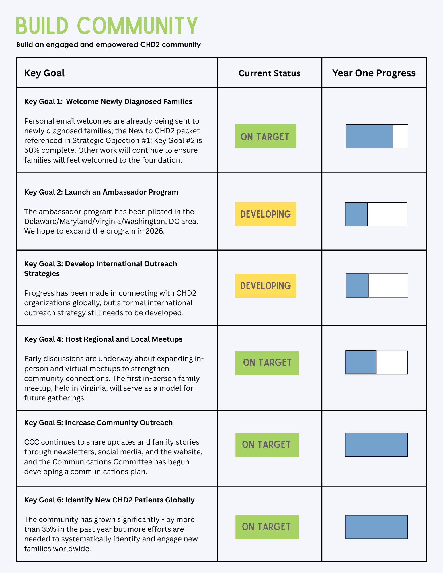 Overall, CCC has built a solid foundation across education, community engagement, and research. Continued focus on coordination, leadership, and resourcing will enable the organization to move from early progress to long-term, sustainable impact for the global CHD2 community. Families, clinicians, researchers, and supporters are encouraged to get involved, whether by volunteering time, participating in studies, joining committees, and/or contributing financially. Every level of engagement and every donation fuels the next step forward. Together, we can accelerate education, strengthen community connections, and drive the research that will shape a better future for all individuals living with CHD2.